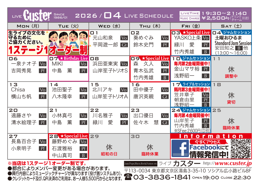 ■ウィークエンドジャムセッション■ ※当店はリーズナブルな価格でのライブの提供を心がけております。クレジットカードのご利用は、お一人様5,500円(税込)からのみとさせていただいております。 |